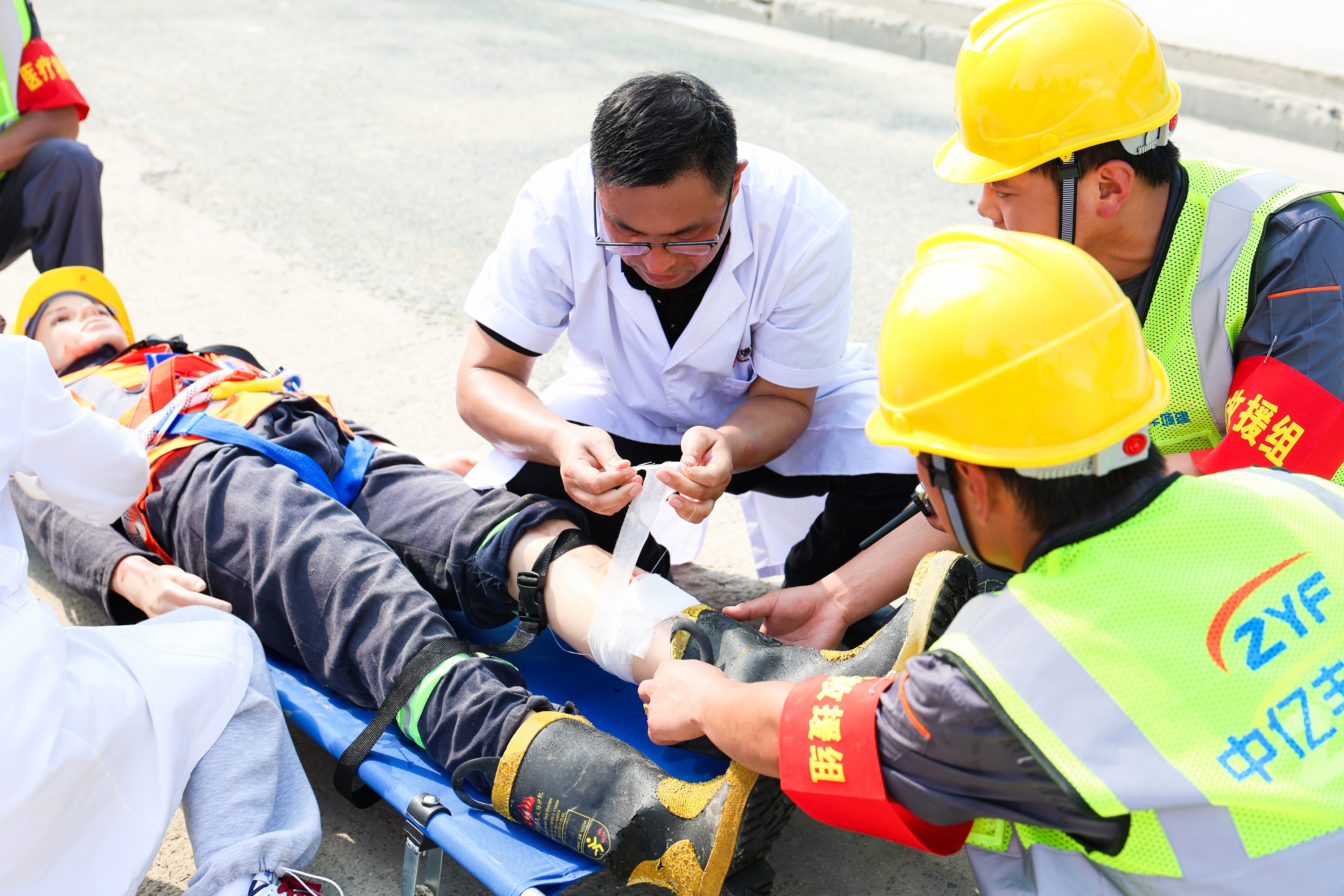 實(shí)戰(zhàn)化演練場景:高鐵蘇州北站落客快速聯(lián)絡(luò)道工程LLD-TJO5標(biāo)西公田區(qū)域60號(hào)墩柱支架搭設(shè)作業(yè)過程中,15:45一名作業(yè)人員不慎高空墜落“受傷”,現(xiàn)場安全員在安全巡視時(shí)發(fā)現(xiàn)險(xiǎn)情,項(xiàng)目部立即啟動(dòng)三級(jí)應(yīng)急響應(yīng)。安全員即刻吹響警報(bào),搶險(xiǎn)救援組、醫(yī)療救護(hù)組、安全警戒組、通信聯(lián)絡(luò)組、后勤保障組等按分工展開救援,無人機(jī)升空實(shí)時(shí)監(jiān)控現(xiàn)場。救援人員采用脊柱板固定傷員,擔(dān)架配合轉(zhuǎn)運(yùn)至安全區(qū)域,120急救中心聯(lián)動(dòng)實(shí)施心肺復(fù)蘇演練。