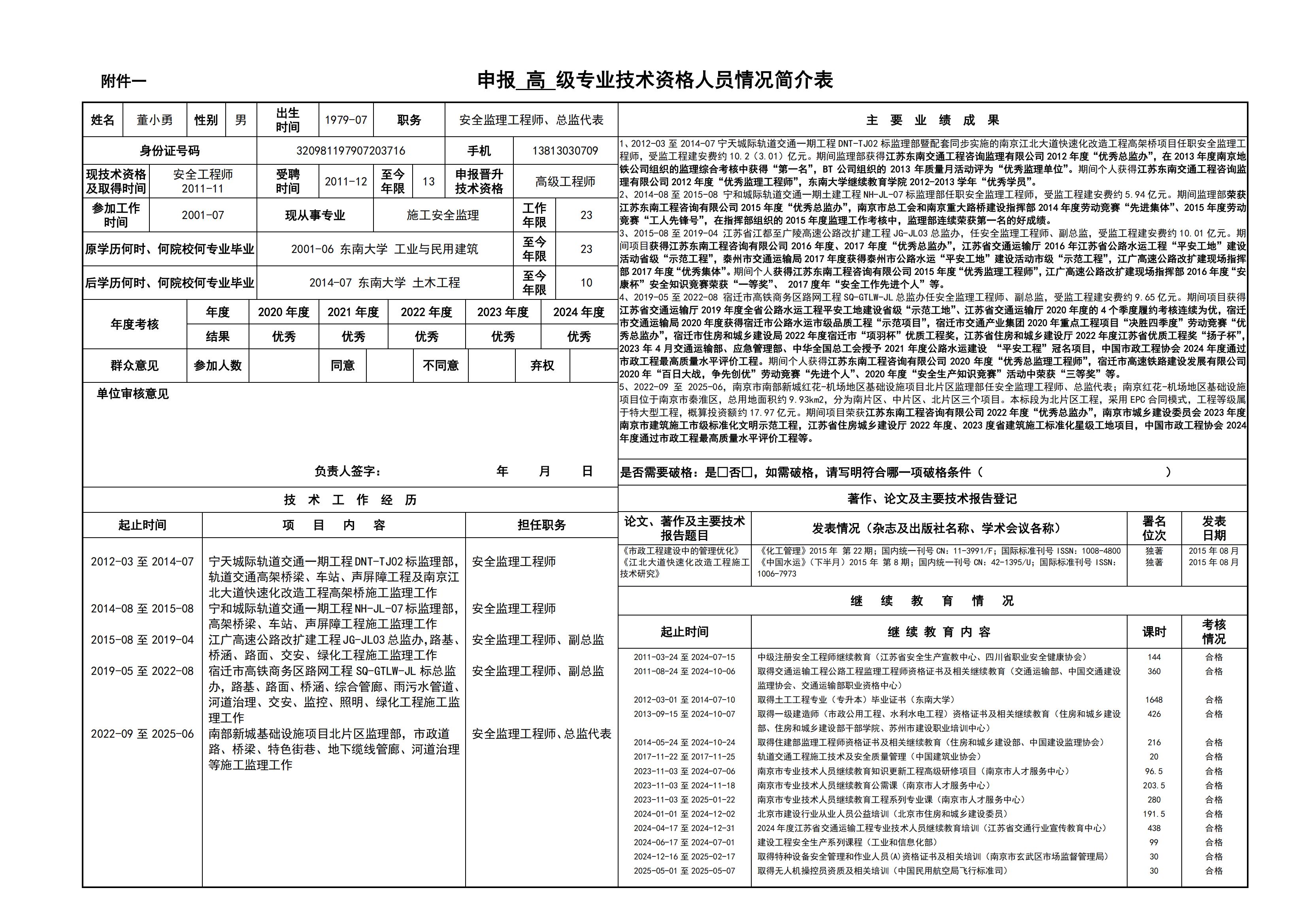 董小勇 性別:男;出生年月1979年07月20日。2001年06月畢業于東南大學工業與民用建筑專業,大專畢業;2006年06月結業于東南大學道路與鐵道工程專業,碩士研究生結業;2014年07月畢業于東南大學土木工程專業,本科畢業;2008年9月通過全國統一考試取得注冊安全工程師資格;2011年11月依據可比照認定原則及《注冊安全工程師執業資格制度暫行規定》,經南京市職稱(職業資格)工作領導小組辦公室確認,具備工程師專業技術資格;2011年12月至今聘任為工程師資格。繼續教育學時滿足申報高一級職稱要求?,F任江蘇東南工程咨詢有限公司南部新城基礎設施項目北片區監理部總監代表兼安全監理工程師一職。